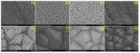 Field emission scanning electron microscopy (FESEM) image of the top view of ZnO NRs of treatment times (a) 3 h, (b) 4 h, (c) 5 h, and (d) 6 h on bare Si substrate and (e) 3 h, (f) 4 h, (g) 5 h, and (h) 6 h on textured Si substrate.