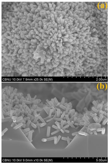 FESEM image of (a) top and (b) cross-sectional view of ZnO NRs for 5 h.