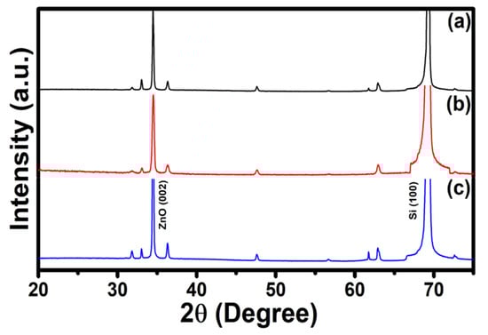 The growth of ZnO NRs on the surface of the textured Si wafer were analyzed to examine the crystalline phases by XRD measurements. XRD patterns of all ZnO NRs AR layers exhibit all the characteristics of the diffraction peaks of ZnO, along with a strong Si phase, which are located at 34.38° (002) and 69.26° (001), respectively, as shown in Figure 4. The observed diffraction peaks confirm the perfect crystal of ZnO, having the hexagonal wurtzite phases of ZnO materials [35] along with the monocrystalline crystalline phase of Si. This examination clearly deduces the growth of single crystalline ZnO NRs on a Si surface via the low-temperature solution method, followed by annealing at 250 °C for 1 h.
