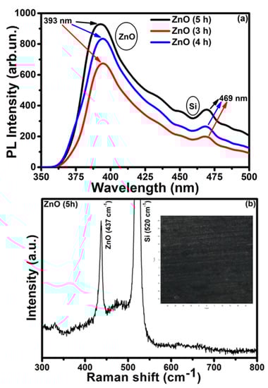 Photoluminescence (PL) spectroscopy in Figure 5a revealed emission peaks at 393 nm for ZnO NRs at 3 h, 4 h, and 5 h, respectively. The small emission peak at 469 nm belongs to the Si wafer. The PL intensity increased as the reaction time increased, due to an increase in length of the ZnO NRs on the Si substrate. The existence of a prominent PL emission near 400 nm confirms the formation of ZnO on the Si wafer [36]. Moreover, the structural behavior of grown ZnO NRs is further elucidated by the Raman spectroscopy (Figure 5b), which exhibits a sharp Raman band at 437 cm−1 with a Si peak. The Raman band at 437 cm−1 corresponds to the typical E2 mode, which normally originates from the hexagonal wurtzite phase of ZnO, deducing the creation of ZnO NRs on the Si surface. No other Raman bands were detected, confirming the high purity ZnO crystal without any surface defects.