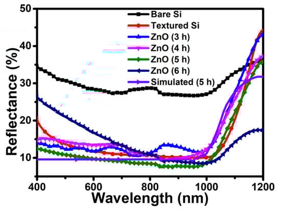 Ultra-violet diffuse reflectance spectroscopy (UV-DRS) has been carried out to evaluate the optical properties of vertically arranged ZnO NRs on Si wafers with reaction times of 3 h, 4 h, 5 h, and 6 h. In Figure 6, the bare Si wafer displays an average reflectance of ~38% in the wavelength range of 400–1000 nm, whereas after texturing the Si wafers, the average reflectance has reduced to 14%. The vertically arranged ZnO NRs on the Si wafer detected an average reflectance of ~12.36% for 3 h, 12.69% for 4 h, 9.58% for 5 h, and 14.95% for 6 h, covering a large wavelength range from 400–1000 nm. As seen in Figure 6, the significant reduction in the reflectance to ~9.58% was recorded in the 5 h reaction time on the Si wafer, which might be due to the generation of multiple reflections of the incident light by the vertically arranged nanorods. The optimized average reflectance of 9.58% at 5 h of treatment time (experimental) is well matched with the average reflectance of 9.79% obtained by the simulation, which is clearly validated in the simulation data as shown in Figure 6.