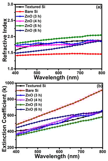 The other optical properties, such as the refractive index (n) and extinction coefficient (k) of ZnO NRs on Si wafers, are crucial to develop efficient Si solar cells, as explored in Figure 7, and are extracted from the reflectance results [37,38,39]. As compared with other reaction times, the highest refractive index of 1.92 and lowest extinction coefficient are observed by the vertically arranged ZnO NRs on Si wafers with an optimized reaction time of 5 h, as shown in Figure 7a,b. Noticeably, the low k value in the whole visible region represents the weak absorption and large photonic energy of light via the black colored surface of the Si wafer.