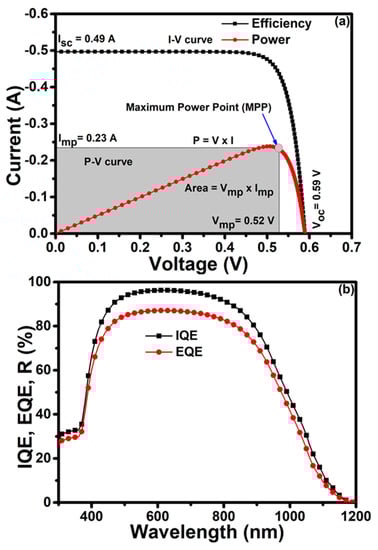 (a) I-V curve with a power curve and (b) incident photon-to-electron conversion efficiency (IPCE) curve of Si solar cells based on ZnO NRs antireflection (AR).