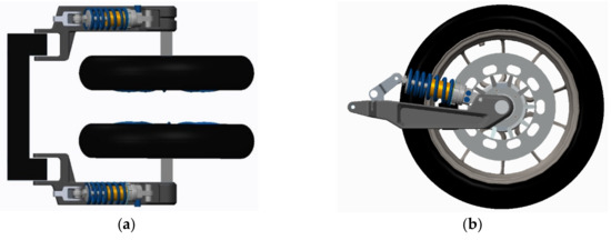 The proposed swingarm design is installed on the front suspension system of a three-wheel electric motorcycle (Daedalus). Using two wheels at front, two identical single-sided swingarms are used to hold the wheels. The top and side view of this assembly is shown in Figure 2a,b, respectively. In order to calculate the forces acting on the testbed vehicle, the technical specifications and corresponding dimensions of CoG related to Figure 1 are presented in Table 3.