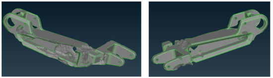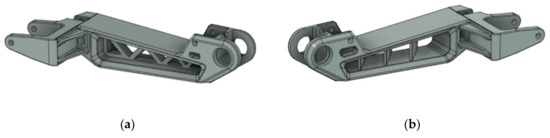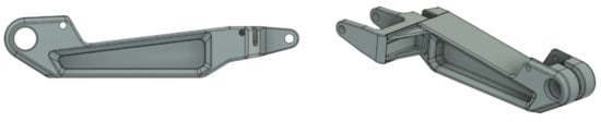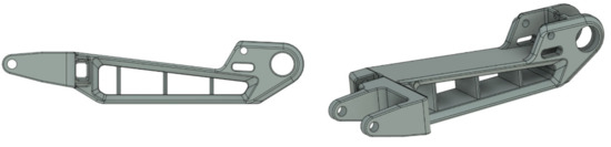 The first alternative design showed a weight reduction of 13% (4.94 kg), while the second alternative provided even higher weight reduction of 18.5% (4.62 kg). Considering the results of analysis, the first one presented higher maximum stress (37.2 MPa—first, 25.63 MPa—second) while both had almost the same displacements (0.38 mm—first, 0.37 mm—second). It is evident that the second design alternative was the type of design we should focus on for the final version. The final form was slightly changed, mostly affected by our production capabilities, where CNC machining manufacturing was chosen. According to the redesign procedure followed, the final swingarm design is presented in Figure 13.