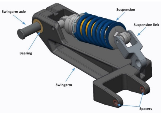 The initial design of the single-sided swingarm is presented in Figure 3, while the assembly of related components that are included in the simulation, is shown in Figure 4. As shown, at the back side the swingarm is connected to the chassis through an axle inserted in the spacers, while on the front it is connected to the wheel through the swingarm axle. The front axle is attached on the swingarm with two bearings and its other side is connected to the wheel using a hub center steering system.