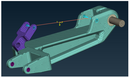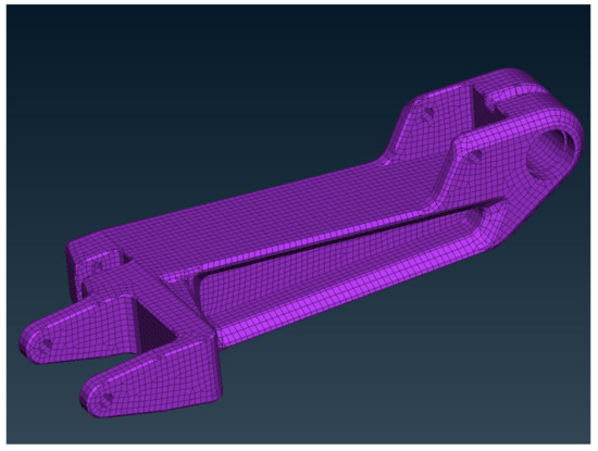 The ANSA pre-processor is used for the development of the geometry mesh and volume elements are used for higher results accuracy (Figure 5). The mesh of the swingarm has 97,259 volume elements, from which 87,475 are Tetras and 9784 are Pyramids elements. The total mesh of all the components included in the swingarm assembly has 116,818 volume elements (Figure 6).