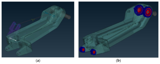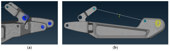 The connection of different components in the assembly is defined using bolts, related to suspension and suspension link, or contact functions for spacers and bearings. Figure 7a presents bolts connections placement and Figure 7b depicts the contact connections as modelled on the assembly.