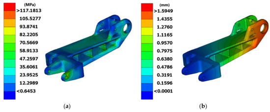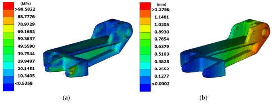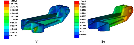 In this part, the force applied is Nf = 786.45 N, which corresponds to weight distribution on the front wheel (Section 3.2). Stress results and related displacements for the swingarm are shown in Figure 9.