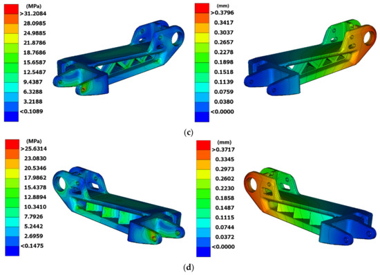 Different swingarm versions and results: (a) 1st alternative swingarm design; (b) 2nd alternative swingarm design; (c) results of stresses and displacements for 1st alternative swingarm; (d) results of stresses and displacements for 2nd alternative swingarm.