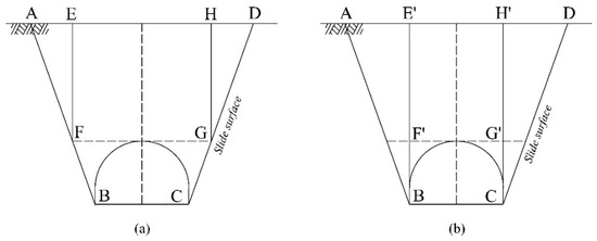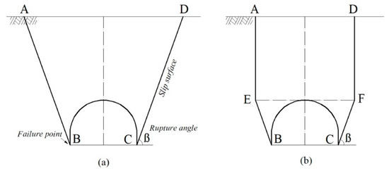 Schematic diagram of the surrounding rock slide surface: (a) Slide surfaces proposed by A. Bierbaumer and K. Terzaghi [6,7]; (b) Slide surfaces proposed.