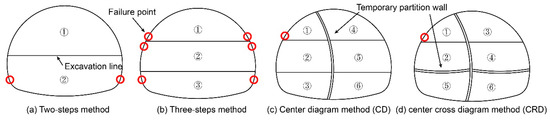 The generation of the slide surface is closely related to the displacement of the overlying strata layer of the tunnel, and the magnitude and law of the overlying strata layer displacement are considerably different due to different tunnel construction methods [8]. Therefore, the influence of construction methods should be considered in the generation of the slide surface. To control the surrounding rock settlement effectively and avoid collapse, the loess tunnel generally adopts the partial excavation methods, such as the two-steps method, three-steps method, the center diagram method (CD), and the center cross diagram method (CRD), as shown in Figure 3; the number in the figure is the excavation sequence. The collapse boundary inside the tunnel can represent the location of the failure points of the slide surface. Table 2 shows the statistics relationship of construction methods and failure points of sixteen shallow buried loess tunnels, the relevant data are obtained from the literatures [22]. It can be seen that the collapse of surrounding rock is most common during the excavation of upper and lower steps. When the collapse occurs during the excavation of the upper or middle steps, the failure point is generally located near the arch waist, and the failure point caused by the lower step excavation is at the arch foot of the tunnel, as shown in Figure 3. Therefore, there are two possible locations for slide surface failure points in the shallow buried loess tunnel, which are the arch waist and the arch foot.