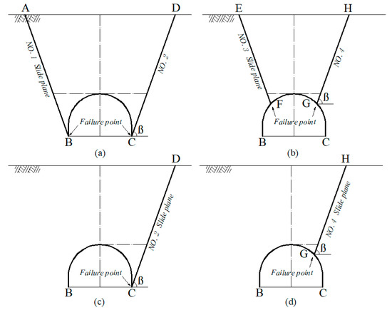 The characteristics of the surrounding rock slide surface of a shallow buried tunnel can be described with three factors of surrounding rock, namely, failure point, fracture angle β, and slide surface shape, as shown in Figure 2a. Table 1 illustrates the characteristics of three typical slide surfaces. As shown in Figure 2a, the first is the slide surface proposed by A. Bierbaumer and K. Terzaghi, whose failure point of the surrounding rock is located at the arch foot. The fracture angle β is 45° + φ/2, and the slide surface is an oblique line [7]. This slide surface is widely applied in the calculation of surrounding rock pressure [6]. The second is the slide surface proposed by Xie Jiaxiao, whose failure point of the surrounding rock is also located at the arch foot, and the shape of this slide surface is the same as the first slide surface. However, the failure angle needs calculating from the friction angle φc of surrounding rock and the friction angle θ of slide surface [20]. Considering the universal vertical joints in the loess, Yu Li et al. have put forward a different shape of slide surface [21], as shown in Figure 2b. The slide surface above the horizontal depth of the tunnel vault is vertical, the failure point of surrounding rock is still arch foot, and the slide surface is the broken line AEB and CFD. The fracture angle β can be calculated from the thickness H of the overlying loess, the tunnel excavation width B, and the friction angle φ of the loess.