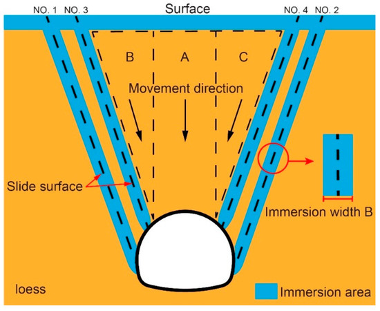 When the buried depth of the loess tunnel is shallow, the irrigation water and seasonal rainfall can infiltrate quickly along the slide surface to the vicinity of the lining structure, as shown in Figure 5. For illustrative purposes, four slide surfaces are all shown. The immersion range of the slide surface is characterized by the immersion width B. When the flood softens loess around the slide surface, and strength of the slide surface reduces. The vertical settlement of the tunnel overburden of regions A, B, and C causes an increased load and more significant deformation on the lining, leading to lining cracking in varying degrees [24]. From a qualitative perspective, there is a close relationship between the water infiltration of slide surface and the appearance of lining cracks, and the immersion width of the loess around the slide surface determines the value of the lining load.