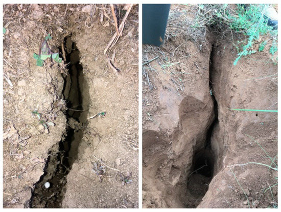 The excavation of a shallow buried loess tunnel causes changes and adjustments of the stress state of the overlying stratum in varying degrees. The construction deformation forms longitudinal cracks on the ground surface on both sides of the tunnel centerline in a short time. The cracks incline to the centerline line of the tunnel in the form of a curved surface in the depth direction and form a settlement grooves within a specific range of the stratum [1,2]. The soil in the groove is wedge-shaped and tends to slide toward the excavation free surface. When the tensile or shear stress of the slide trend surface is greater than the soil strength, the actual surrounding rock slide surface of the shallow loess tunnel forms [3]. The slide surface is the most critical feature of the shallow buried loess tunnel, which provides a fast channel for the surface water infiltration [4], and the deepest slip surface can reach near the tunnel lining. The water immersion softens the loess around the slide surface, resulting in the mechanical property decays rapidly with the increase of the sinking tendency of sliding wedge, which may cause the loads on the support structure and the deformation to increase. In severe cases, the secondary lining may crack and fall off [5]. The flooding of the slide surface is bound to have a significant impact on the appearance and development of cracks.