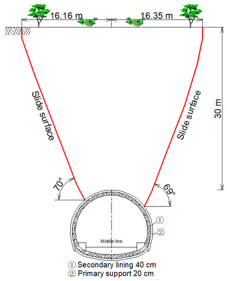The vertical joints of loess are usually well developed. The vertical crack of the Gaoqiao tunnel was surveyed with the pit exploration method, which was found to be at a value of 1.2 m [23]. The length of the vertical slide surface is much less than the tunnel buried depth, so the surface vertical slide surface can be ignored. The shape of the slide surface should still be represented by the oblique line.