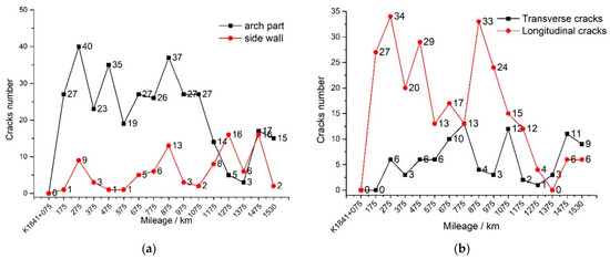Statistical graphs of lining cracks number (accumulation per 100 m): (a) cracks in arch part and side wall; (b) transverse and longitudinal cracks.