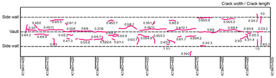 The Figure 19 shows the comparison of inner surface cracks between test results of case 3 and lining inspection results in sections K1841 + 475~K1841 + 495. Because the field inspection of inner surface of secondary lining concerns the locations from right side wall to the left, so the corresponding inner surface cracks in model test are parts of cracks in case 3. The inspection results show that the cracks appeared in the vault and both side of side wall, and all cracks were longitudinal. The average length and width are 9.4 m and 0.9 mm for vault cracks, respectively, and 5.55 m and 0.6 mm for left sidewall cracks, respectively. The crack in right side wall is only 0.3 mm width and 2.3 m length, which is much narrower and shorter than the other cracks. It indicates that the vault cracks are more serious than on the left side wall, and that the cracking of left side wall is more serious than that of right side wall. The cracks distribution in case 2 of model test shows that the vault cracks much earlier than the left side wall. Because the vault of lining has the largest deformation (Figure 15c), the vault crack is wider than the crack in left side wall. The vault lining cracks also more serious than the left side wall. The right side wall has no cracks. Thus, the field inspection results of the tested section are basically consistent with the model test results, verifying the reliability of outcomes of the model test.