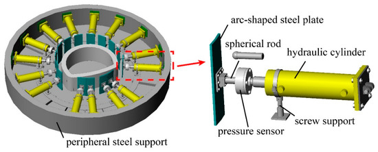 Figure 11 illustrates the overall design of the loading system, which is the core system. As can be seen, the loading system is mainly composed of fifteen sets of hydraulic cylinders, pressure sensors, spherical push rods, arc-shaped steel plates, and peripheral steel supports. Fifteen sets of hydraulic cylinders are symmetrically distributed on both sides of the lining model. The function and the performance parameters of each component are as follows. The stroke of the loading cylinder is 230 mm, and the maximum loading is 17.80 MPa. There is a deviation between the pressure inside the cylinder and the loading force. A pressure sensor with monitoring accuracy of 10 Pa is installed in the front section of the cylinder to monitor the load on the lining model accurately. The spherical push rod connects the pressure sensor and the arc-shaped steel plate to ensure that the lining load is always in the normal direction of the outer surface of the model lining. The height of the arc-shaped steel plate is 40 cm, and the arc length is 14 cm. The arc of the steel push plate is consistent with the arc of the outer surface of the lining, which is closely attached to the lining to avoid stress concentration. During the test, a 1 cm thick elastic rubber pad is added between the push plate and the lining model. The petroleum jelly is applied to the rubber pad to reduce friction and ensure that the load is evenly applied. The peripheral steel supports are welded with an 8 mm steel plate with internal ribs inside, whose rigidity is strong enough to ensure that the cylinder pressure will not be unloaded due to the deformation of the steel support.