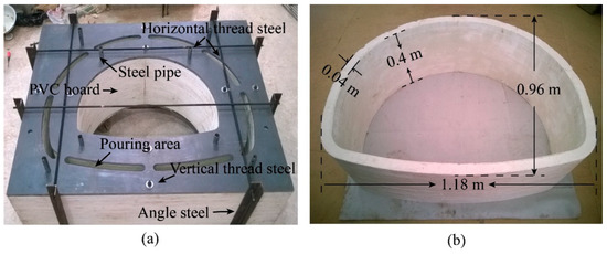 The casting of the model uses a self-made mold made of polyvinyl chloride (PVC) board, as shown in Figure 12a. The mold is 40 cm high and composed of twenty-six layers of PVC boards, which are divided into an inner mold and an outer mold, and the space between these two is used for pouring similar materials. The PVC sheet adopts eight steel tubes for vertical positioning. Twelve groups of horizontal and vertical screw steel zippers are forced to squeeze on six sides to ensure the tightness and stability of the mold. The model was fully vibrated during the casting process. After the pouring was complete, the mold was removed one day later, and then maintained until the lining model was completely dry. Figure 12b shows the completed tunnel model. The geometric dimension of the model is 1/10 of the prototype, the thickness of the lining model is 4.0 cm, the span is 1.18 m, the height is 0.96 m, and the axial length is 40 cm.