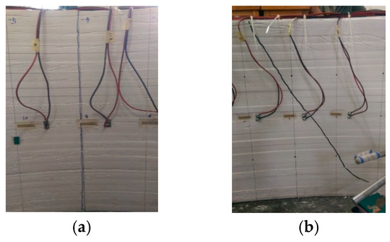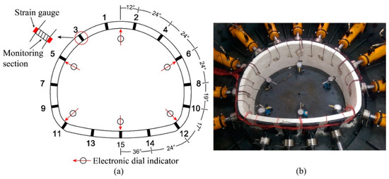 During the test, the internal force, deformation, and cracks of the lining were monitored. The monitoring sections of the internal force and deformation are shown in Figure 9, there are fifteen monitoring sections, from 1 to 15, in the tunnel model. As can be seen from Figure 13a, the BX120-20AA resistance strain gauges were installed, the strain gauge was 2 cm long, the resistance value was 120 ohms, and the sensitivity coefficient was 2%. The internal forces of the arch sections 1–6, the sidewall sections 7–10, and the arch foot and inverted arch sections 11–15, can be calculated with the formula of the relationship between the inner and outer strain of the lining. The radial deformation of the lining was monitored with the WBD-50 A high-precision electronic dial indicators. The measurement points of the radial deformation were arranged at the center of the lining vault, arch waist, arch foot, and inverted arch. The recording of cracking time and shape drawing was done manually. The cracking times were recorded at any time during the test. The shape drawing of lining crack was completed during the five minutes of pressure maintenance period after the application of each level of load. The monitoring element layout is shown in Figure 13b.