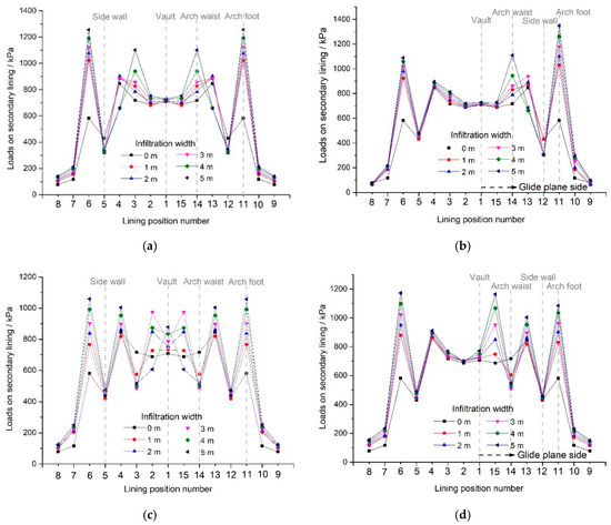 The load values on the secondary lining of the shallow buried loess tunnel under the four cases are shown in Figure 14a–d. Figure 14e shows the load monitoring points corresponding to the abscissa of Figure 14a–d. The positions of load monitoring points are the loading positions of the hydraulic cylinders in the loading system of test equipment, and in the center of two adjacent monitoring sections. For better understanding, the monitoring sections in Figure 13a are marked in Figure 14e. It can be seen that the slide surface immersion caused the load on arch foot (Nos. 6 and 11) to increase. Comparing the load at the positions 6 and 11 in case 1 (Figure 14a), case 2 (Figure 14b), case 3 (Figure 14c), and case 4 (Figure 14d), it can be seen that the increased value caused by the immersion of the arch foot slide surface was higher than what caused by the immersion of the arch waist slide surface. For the arch of the tunnel, the lining load at the arch waist (Nos. 3 and 14) increased when the arch foot slide surface was flooded. The effect of the arch waist slide surface immersion mainly caused the load increase at the arch shoulder (Nos. 2 and 15), and the position of the increased load is closer to the vault. In addition, it can be seen from the load distribution form that the immersion of the slide surface on one side caused the bias pressure. The loading force of the fifteen sets of loading devices in the model test was converted according to the area load similarity ratio Cq = 10.