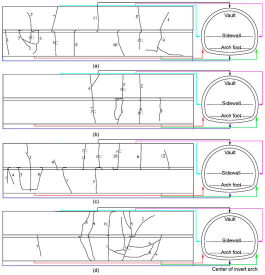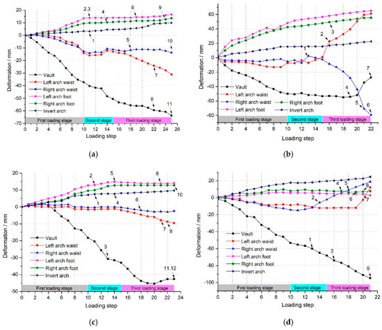 The numbers in Figure 15 are the lining cracks numbers, and the points indicated by the arrows are the deformation monitoring points closer to the crack, whose corresponding load step is the cracking time. The occurrence of the cracks can be considered as the result of the large deformation of the lining. From the perspective of the effect of the cracks on the deformation, after No. 1 cracks in the inverted arch, Nos. 2, 3, and 4 cracks in the arch foot in Figure 15a; Nos. 1 and 4 cracks in the inverted arch, and Nos. 2 and 5 cracks in the arch foot in Figure 15c appears, where the trend of the deformation curve of the arch foot and the inverted arch was unchanged. Therefore, the lining cracking at the arch foot and the inverted arch is less relevant to the deformation. However, in the lining vault and the arch waist, there is an individual relationship between the lining cracking and the sudden increase of deformation. Some cracks appeared at the inflection point of the curve trend, such as the No. 5 crack in the right arch waist in case 1, the No. 3 crack in the vault in case 3, the No. 2 crack in the left arch waist in case 2, and the No. 2 crack in the right arch waist in case 4.