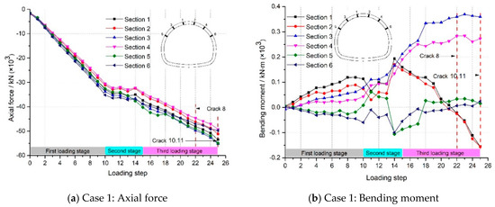 It can be seen from Figure 17b that the bending moment trend at the symmetrical position of lining is the same, and the magnitudes are not much different. In the second loading stage (loading step 10–15), the bending moment of the vault and the arch waist decreased first and then increased, and finally bent in the opposite direction, while the bending moment of the arch shoulder always increased. The bending moments of the Sections 1 and 2 of the vault, and the Sections 5 and 6 of the arch waist, began to decrease and develop in the opposite direction due to the loading step 14 (immersion width 4 m). No cracks appear in the arch during this stage.