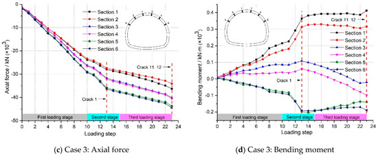Figure 17 shows the internal force curves of Sections 1–6 in the bilateral slide surface immersion cases (cases 1 and 3). Figure 17a,b illustrates the axial force and bending moment curve of arch six sections under the bilateral arch foot slide surface immersion case (case 1), respectively. It can be seen from Figure 17a that the entire lining arch was compressed during the test. The axial force increased linearly, the same as their change trend. During the second loading stage (loading step 10–15), the axial force of the lining arch changed little.