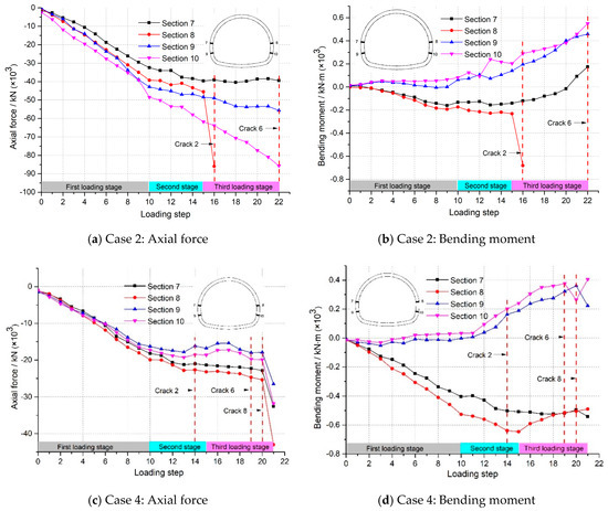 Figure 18 shows the internal force curve of Sections 7–10 of the sidewall in the unilateral slide surface immersion cases (cases 2 and 4). The sections 7–10 are the monitor sections in tunnel sidewall, as shown in Figure 13a. Figure 18a,b illustrates the axial force and bending moment curve of the four sections of sidewall under the unilateral arch foot slide surface immersion case (case 2), respectively. It can be seen in Figure 18a that the lining sidewall was compressed during the test. The axial force of Sections 8 and 10 on the side of the immersion slide surface was more significant than that of Sections 7 and 9 on the other side. The axial force of Sections 9 and 10 near the arch foot was greater than that of the Sections 7 and 8 on the upper side. The bending moment variation curve also showed the same law. At the loading step 16, the crack 2 passed through the strain gauge at Section 8. The strain gauge failed, and the strain data overflowed. The external surface of the sidewall cracked, and the axial force of Section 8 increased suddenly. The axial force trends at other locations did not change. It can be seen from Figure 18b that Sections 9 and 10 always bent inward, and Sections 7 and 8 always bent outward, before the lining lost stability. At the loading step 16, the bending moment of Section 7 began to decrease and finally changed from bending outward to bending inward.