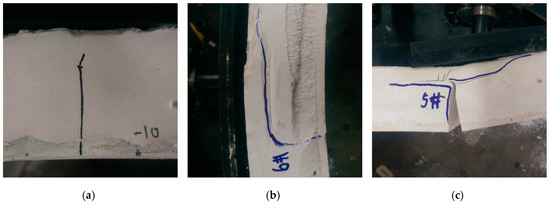 It is difficult to identify the development of cracks in the direction of the thickness of the lining in the operating tunnel. Therefore, there is a lack of data about the development of the cracks in the thickness direction. Figure 21 shows three types of cracks in the thickness direction of the lining model, which are I-type, L-type, and Y-type. During the test, it was found that the cracks have distinct development rules in the thickness direction. The cracks will always start with I-type, then develop into L-type, and finally develop into Y-type. The Y-type can lead to the instability of the lining. Therefore, I-type, L-type, and Y-type cracks can be defined as the initial crack, the medium-term crack, and the late-term crack, respectively. Among the thirty-nine cracks, six cracks are I-type and accounted for 15.4% of the total number of cracks; twenty-seven cracks are L-type, accounting for 69.2%; and six cracks are Y-type, accounting for 15.4%. The number of initial cracks is equal to that of late-term cracks, while the medium-term cracks occupy the absolute advantage of the total number of cracks.