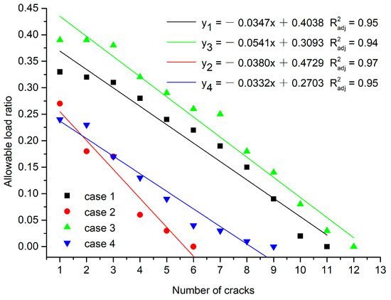 Figure 22 shows the curve of the allowable load ratio of cracked lining with the number of cracks. It can be seen that after the first cracking of the lining, the allowable load ratios of the four cases are all less than 40%, where the lining under the bilateral arch waist slide surface immersion case (case 3) has the most significant allowable load ratio of 39%. The allowable load ratios of the bilateral arch foot slide surface immersion case (case 1), the unilateral arch foot slide surface immersion case (case 2), and the unilateral arch waist slide surface immersion case (case 4) are 33%, 27%, and 24%, respectively. As the number of cracks increases, the allowable load ratio of the four cases decreases linearly with the linear fitting similarity coefficients of 0.95, 0.94, 0.97, and 0.95, respectively. The allowable load ratio of case 2 decayed fastest, and the slope of the fitted straight line is −0.0541. The decay rate of the allowable load ratio in the other three cases was the same. The slopes of the fitted straight lines were −0.0347, −0.0380, and −0.0332, respectively.