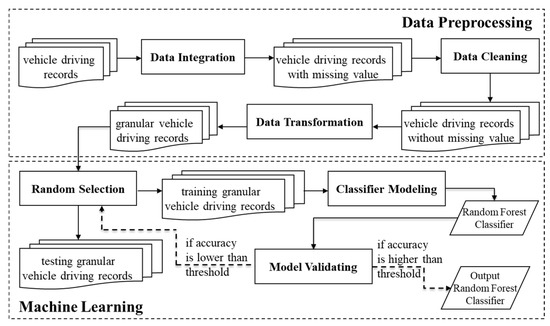 Our proposed method, as shown in Figure 1, consists of two major modules including (1) the data preprocessing module and (2) the machine learning module. The idea of the data preprocessing module was to generate granular vehicle driving records that represent the driving behavior in a low-level data format. Then, after performing the data preprocessing module, we performed the machine learning module that followed the k-fold cross-validation mechanism which ensured that the produced random forest classifier had high reliability.