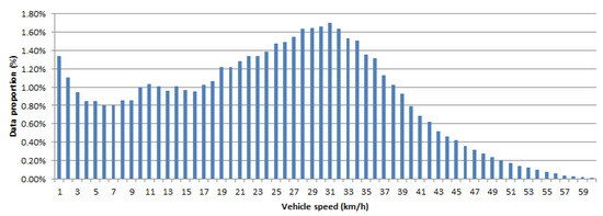 Distribution of the vehicle speed (km/h) in analytical data.