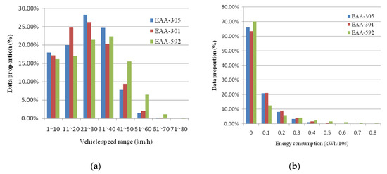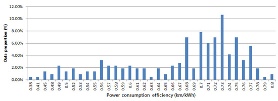 We analyzed the vehicle operating and driving data collected in this study to calculate the daily mileage and power consumption. We divided the daily mileage by daily power consumption to obtain the daily power consumption efficiency (km/kWh). Figure 3 and Figure 4 show the statistical data of the vehicle speed (km/h) and power consumption efficiency. We can observe that both the distributions of vehicle speed and power consumption efficiency are negatively skewed, which means the average vehicle speed is less than the most frequent vehicle speed, and the average power consumption efficiency is less than the most frequent power consumption efficiency. Therefore, we could realize that the average values of the two variables do not have sufficient representativeness. As a result, using the distribution modes in Figure 3 and Figure 4, we summarized the research vehicle‘s eco-driving indicators; the vehicle speed was 31 km/h, and the power consumption efficiency was 0.73 km/kWh. From the aforementioned data, we verified that the research vehicle’s eco-driving regime fell within the medium energy consumption band and the vehicle speed (km/h) and power consumption efficiency at this level of energy consumption accorded with the optimal driving status.