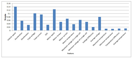 The feature weights of the optimal random forest model are shown in Figure 9. The features with weights that were higher than 0.1 were regarded to be the factors that influence driving energy consumption. The energy consumption factors included features such as vehicle speed, motor speed, and total voltage. The feature trends of power consumption being reduced were evaluated as follows: