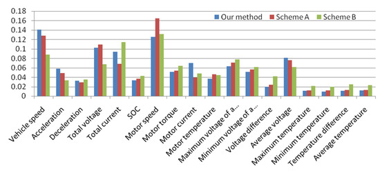 We input the data of the two schemes into the analytical models. The evaluation results of the classification indicators are presented in Table 9. We found that the scores for Scheme A were closer to those of the analytical models used in this study, whereas the F1 score for Scheme B differed significantly from that of the other analytical models applied. Therefore, we concluded that the energy consumption classification for Scheme B was not suitable. Figure 10 shows the comparative distribution of speed and energy consumption in Schemes A and B in this study. From Figure 10a, we observed that the vehicle speeds in this study and Scheme A ranged from 21 to 30 km/h, whereas the vehicle speeds in Scheme B ranged between 31 km/h and 40 km/h. According to the analysis of the vehicle speed and power consumption efficiency in Table 2, medium energy consumption in this study and Scheme A ranged between 0.06 kWh and 0.12 kWh, whereas in Scheme B, it was 0.10–0.16 kWh. We analyzed the analytical models’ power consumption classification methods by considering the power consumption ranges mentioned above and the proportion of driving energy consumption data in Figure 10b. The analysis results showed that this study had the same energy consumption classification as Scheme A, and their data proportions were both approximately 20%; the medium energy consumption of Scheme B was changed to 0.1–0.2 kWh, and its data proportion was increased from 12.5% to 18.5%. Figure 11 shows the evaluation results of the factors which had feature weights higher than 0.1 that influenced energy consumption. The vehicle speed, motor speed, and total voltage were the factors influencing energy consumption in this study and Scheme A, whereas the motor speed and total current were the influencing factors in Scheme B. The comprehensive evaluation results showed that the influencing factors in this study and Scheme A were the same, and consequently, identical analytical models could be constructed for them; the influencing factors in Scheme B differed from this study, and therefore required the construction of different analytical models.