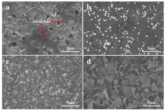 The morphologies of the GSiC substrate surface before diamond deposition, diamond nucleation and growth were observed by the scanning electron microscope (SEM). According to the SEM images of the original substrate (Figure 2a), the scratches caused by grinding were detected. The depressions with the size of 1–2 μm, caused by the relatively soft graphite, which distributed in the silicon carbide ceramics, were clearly visible. After a 0.5 h nucleation process (Figure 2b), very tiny particles which were newly generated diamond seed crystals with the size of 50–300 nm were observed on the surface of the substrate, especially around the graphite depressions. During the deposition process, the tiny particles gradually spread over the substrate surface and continued to grow. After 4 h deposition (Figure 2c), it can be seen the PCD coating was continuous and very dense with the diamond grain size of 0.5–2 μm. Ultimately, the diamond grew to around 4 μm with different orientations after a 6 h deposition (Figure 2d). From the cross-sectional image of the PCD-coated seal ring (Figure 5c), it can be seen that the thickness of PCD coating was about 12.3 μm, and the diamond grown outwards in a randomized fashion.