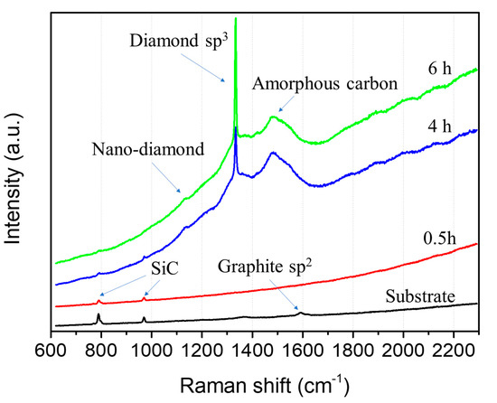 Raman spectrum of the HFCVD diamond coated GSiC seals ring deposited for 0 h (GSiC substrate), 0.5 h (after nucleation), 4 h and 6 h.