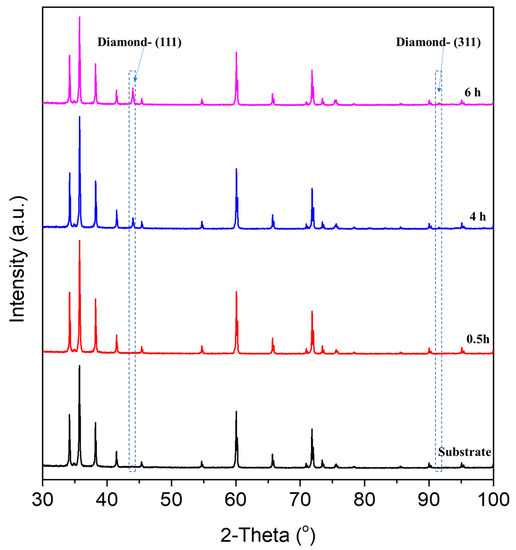 X-ray diffraction results associated with the PCD coating at the critical growth points are shown in Figure 4. It can be seen the GSiC substrate is hexagonal. The presence of diamond (111) and (311) peaks confirmed that the PCD coatings were not textured. The XRD results show the good crystallinity of finial PCD coating, which ensures the unique performance of the diamond itself.