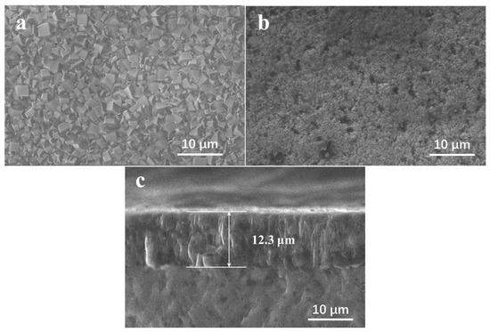 The scanning electron microscope (SEM) images of (a) initial surface, (b) polished surface and (c) cross-sectional morphology of the polycrystalline diamond (PCD) coating.