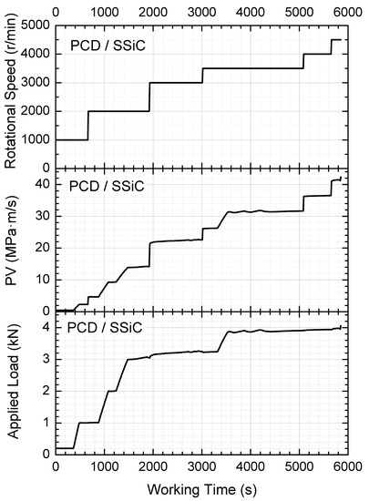 The PV limit as a maximum serviceability parameter in the PCD/SSiC combination of a mechanical seal was tested on the Tribometer described above. Meanwhile, the evolution of PV values with applied load and rotational speed was recorded as shown in Figure 6. In the early stage, the PCD/SSiC combination was started up at 60 N load and accelerated to 1000 rpm. At this point, the load was immediately increased to 0.2 kN for a transient adaptive operation. As the load increased to 1 kN, full sealing was achieved for a PV product of approximately 2.32 MPa·m/s. In the subsequent stages, the applied load at the rate of 1 kN, and the rotational speed at the rate of 500 or 1000 rpm, increased alternately according to the running state of the Tribometer. Every change in rotational speed will result in an instant increase in the PV value, while the PV increases slowly with the load. Ultimately, the mechanical seal gets stuck suddenly during loading from 4 kN to 5 kN at 4500 rpm. The PV limit of prepared PCD/SSiC combination is 42.31 MPa·m/s.