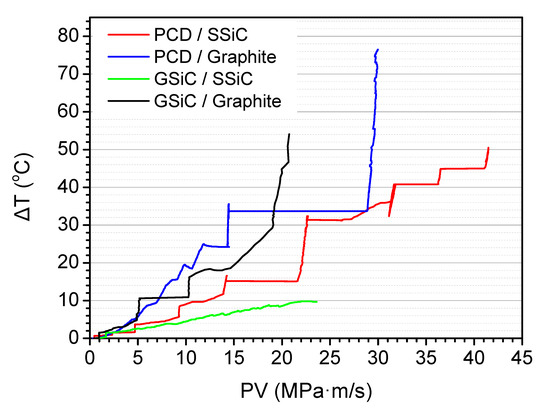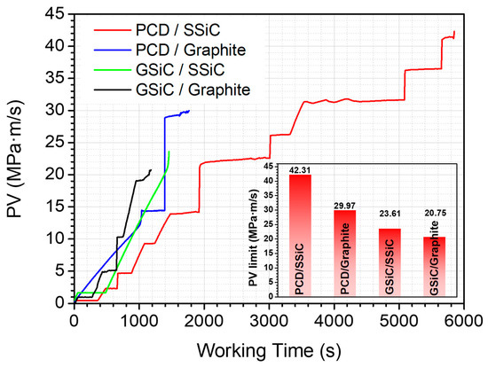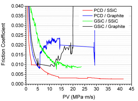 The friction curves corresponding to the variation of the PV value are given in Figure 9. In the initial stage, the friction coefficient of all combinations is higher than 0.2. After some fluctuation with self-polishing (micro-abrasion), resulting in a further accommodation of the contact mating surfaces, low friction values less than 0.04 were obtained. When the operating conditions become severe enough to improve the PV value above 5 MPa·m/s, the friction coefficient diminished very quickly. The trend for hard-to-hard face comparing seals was identified as that reducing the friction coefficient with increasing PV values, which can be seen for the PCD/SSiC combination and GSiC/SSiC combination. In contrast, for hard-to-soft face comparing seals, such as the PCD/graphite combination and GSiC/graphite combinations, the friction coefficient decreases in the initial stage with increasing PV value, then increases moderately in the later stage with increasing load. The reason may be that excessive loads accelerate the wear and tear of graphite because of the low strength of graphite. Broken debris falls into the gap between two seal faces leading to increasing friction. Meanwhile, resulting in the relatively low strength, the graphite seal ring is bound to be damaged early against a high load.