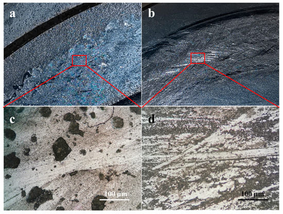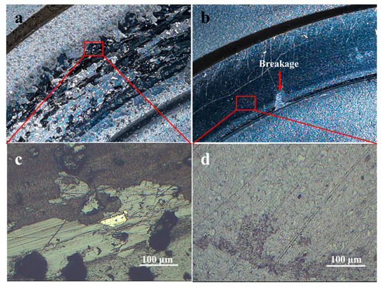 The morphology of the PCD/graphite combination rings after PV testing can be seen in Figure 11. On the surface of the PCD coated ring (Figure 11a,c), the sliding tracks were not obvious, while an amount of adherent graphite was detected. This graphite probably resulted from abrasion and the transfer from the graphite mating face during the PV testing. Macroscopic scratches and breakages can be seen visibly on the surface of graphite ring (Figure 11b,d).