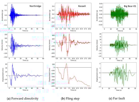 The forward-directivity effect is generated by the velocity of a fault rupture, which is similar to the velocity of shear wave propagation. Forward directivity produces ground motion with a short duration and large amplitude. Fling step occurs due to permanent deformation of the ground induced by the structural transformation of the fault rupture during seismic activity. The fling-step effect generates a large velocity amplitude on one side, which shows monotonic behavior in the displacement time history [32]. Figure 1 shows the recorded time histories of the near-fault and far-fault ground motions. Compared with the far-fault ground motion, the near-fault ground motion with forward directivity shows a high amplitude up to approximately 150 m/s in a short duration, as shown in Figure 1a. The fling-step ground motion produces a maximum displacement of approximately 600 mm and a permanent displacement movement to the negative side of the displacement time history, as shown in Figure 1b.