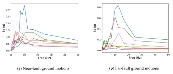 The target site of this study is a shallow and hard ground area with a bedrock depth of approximately 17 m and a shear wave velocity higher than 260 m/s. The Eurocode 8 and UBC 97 standards classify the target site as soil type C and RPA 99/2003 as S3. According to KDS, which accounts for both the bedrock depth and shear wave velocity, the target site was included in the S2 type. Based on the site conditions defined from the shear wave velocity of the actual ground, nonlinear ground response analysis was performed to generate near-fault and far-fault artificial ground motions [38,39,40]. The dynamic properties of the soil used in the ground response analysis involved the unit weight, plasticity index, and shear wave velocity. The property values were determined by the shear wave velocity corresponding to the site classification. Figure 2 shows the response spectrum obtained from the nonlinear ground response analysis according to the amplification of ground motions. The near-fault ground motions included a relatively low-frequency range compared with the far-fault ground motions, but no significant differences were found. The peak values of the response spectrum were approximately 5 to 15 Hz in the near-fault ground motions and 10 to 20 Hz in the far-fault ground motions. The acceleration of the ground motions was rapidly reduced to maintain an almost constant value with increasing frequency after the peak value.
