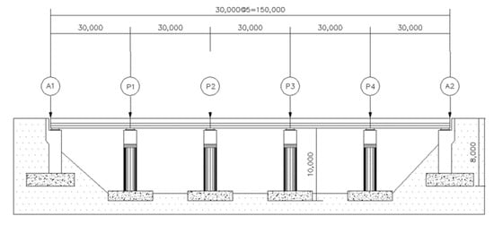 This study selected a constructed PSC bridge widely used in the practical field. Figure 3 and Figure 4 show the side view of a 5-span PSC I-girder bridge and the detailed cross section of the bridge and columns, respectively. The bridge column is supported by the pile foundation, and the superstructure of the bridge is supported by a rubber bearing installed on the columns.