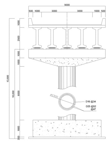 The span length of the bridge was designed to be 30 m, and thus the total length of the bridge was 150 m. The abutment at both ends of the bridge was 8 m in height. All the piers of the bridge were 10 m long with a circular cross section that was 2.3 m in diameter. Longitudinal reinforcement of the pier was designed by a total of 105 D13 rebars installed in the two lines, as shown in Figure 4. A transverse stirrup was installed using D16 rebars at an interval of 300 mm. According to the structural drawing, the concrete compressive strengths of the superstructure and pier were designed to be 27 MPa and 24 MPa, respectively. The yield strength of the longitudinal and transverse reinforcements was 300 MPa.