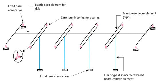 Nonlinear numerical simulation of the bridge was carried out using the OpenSees program [41]. The superstructure was expected to be within the elastic range due to earthquakes and was modeled using elastic elements. The pier of the bridge system, which is the main structural element that resists an earthquake load, was composed of reinforced concrete with longitudinal and transverse steel bars. Therefore, nonlinear fiber elements were used to account for the cracking of concrete and the yielding of bars. The rubber bearing was used to model an elastic-perfectly-plastic behavior using spring elements to consider the inelasticity of the bearing material. The pile foundation was modeled as a fixed boundary condition at the bottom of the piers. Figure 5 presents the numerical modeling of the bridge components used in the study.