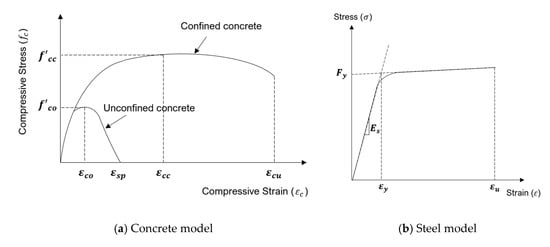 The height of the pier varied from 5 to 25 m to examine the effects of the aspect ratio of the pier. The ratio of the longitudinal reinforcement was set to 1.17% based on the value designed in the actual bridge. The unconfined and confined concrete material properties were designed using the model proposed by Mander et al. [42]. The steel material was designed according to the bilinear model proposed by Menegotto et al. [43] in the tension and compression, and the effect of low-cycle fatigue and bucking of rebars was not considered in the study. Figure 6 shows the stress–strain curves of concrete and steel.